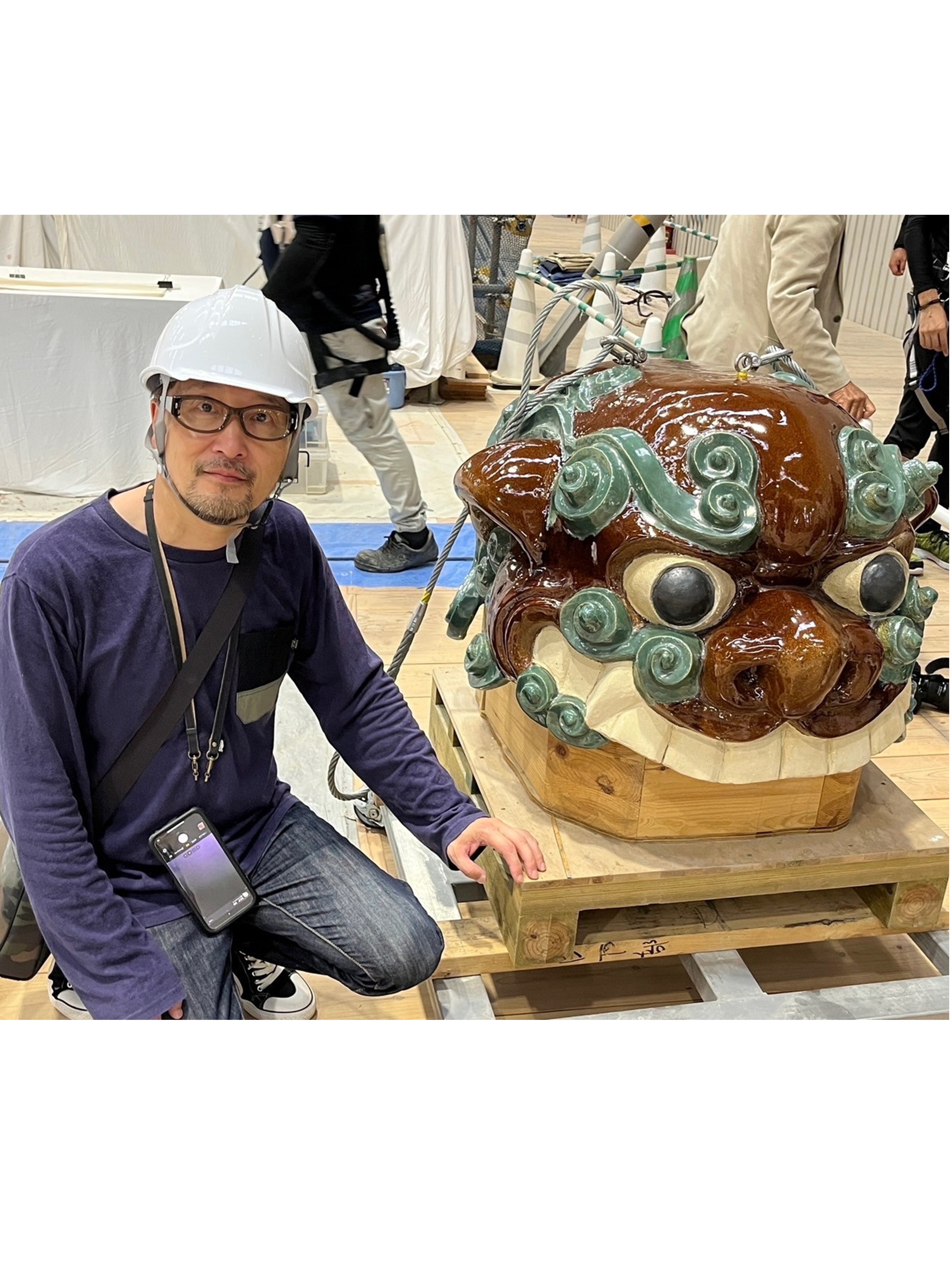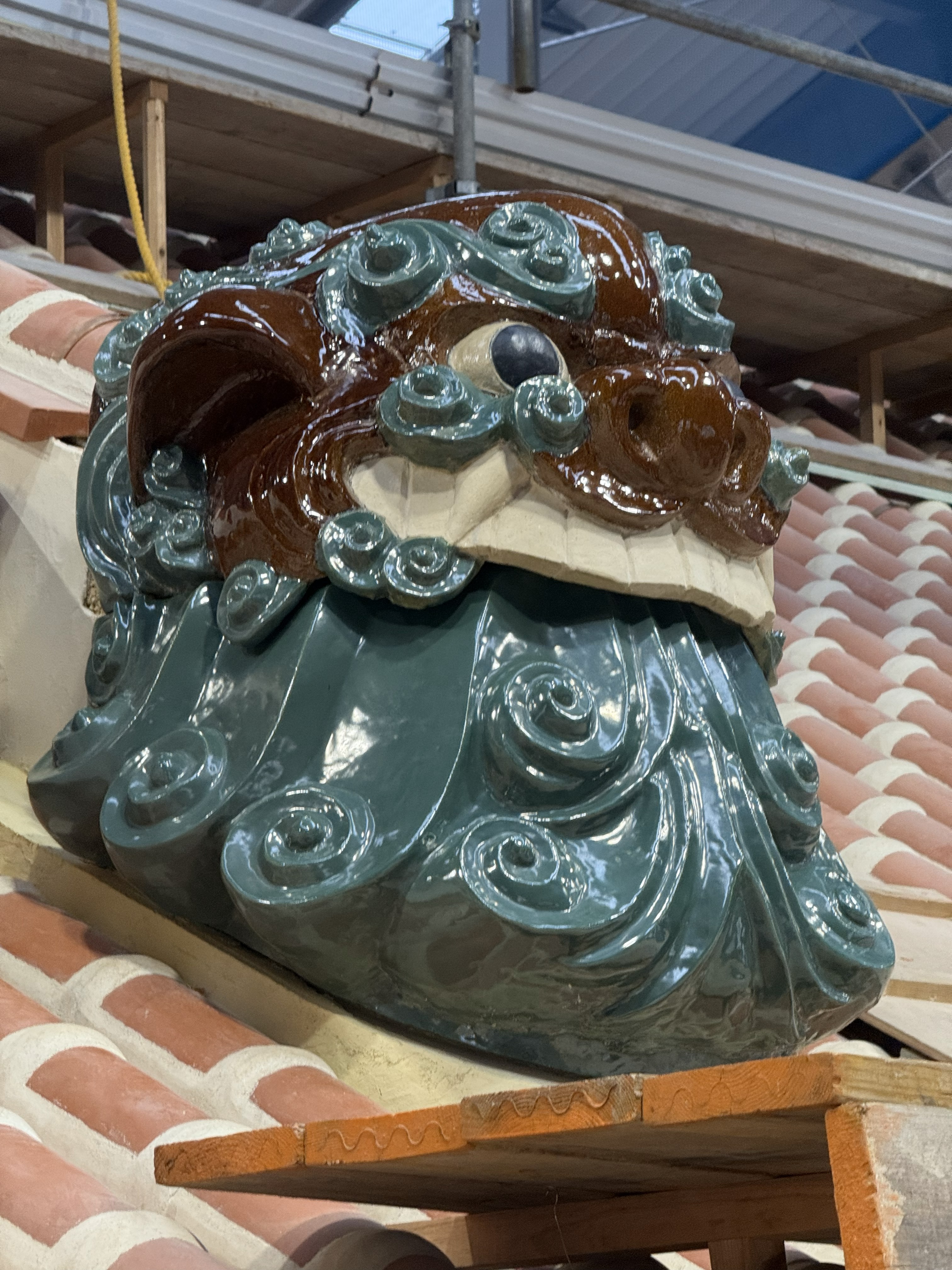 自身制作による鬼瓦吽形2体が、首里城正殿の屋根に設置されました。