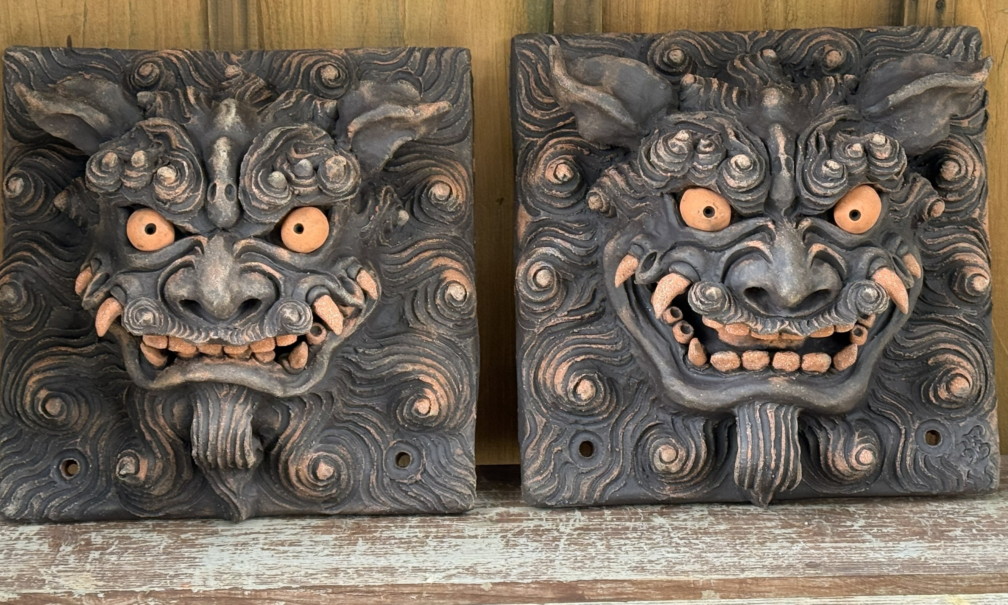 お面のような顔だけの四角顔のシーサーです。顔の直径はおよそ20センチ、25センチ、30センチがあります。