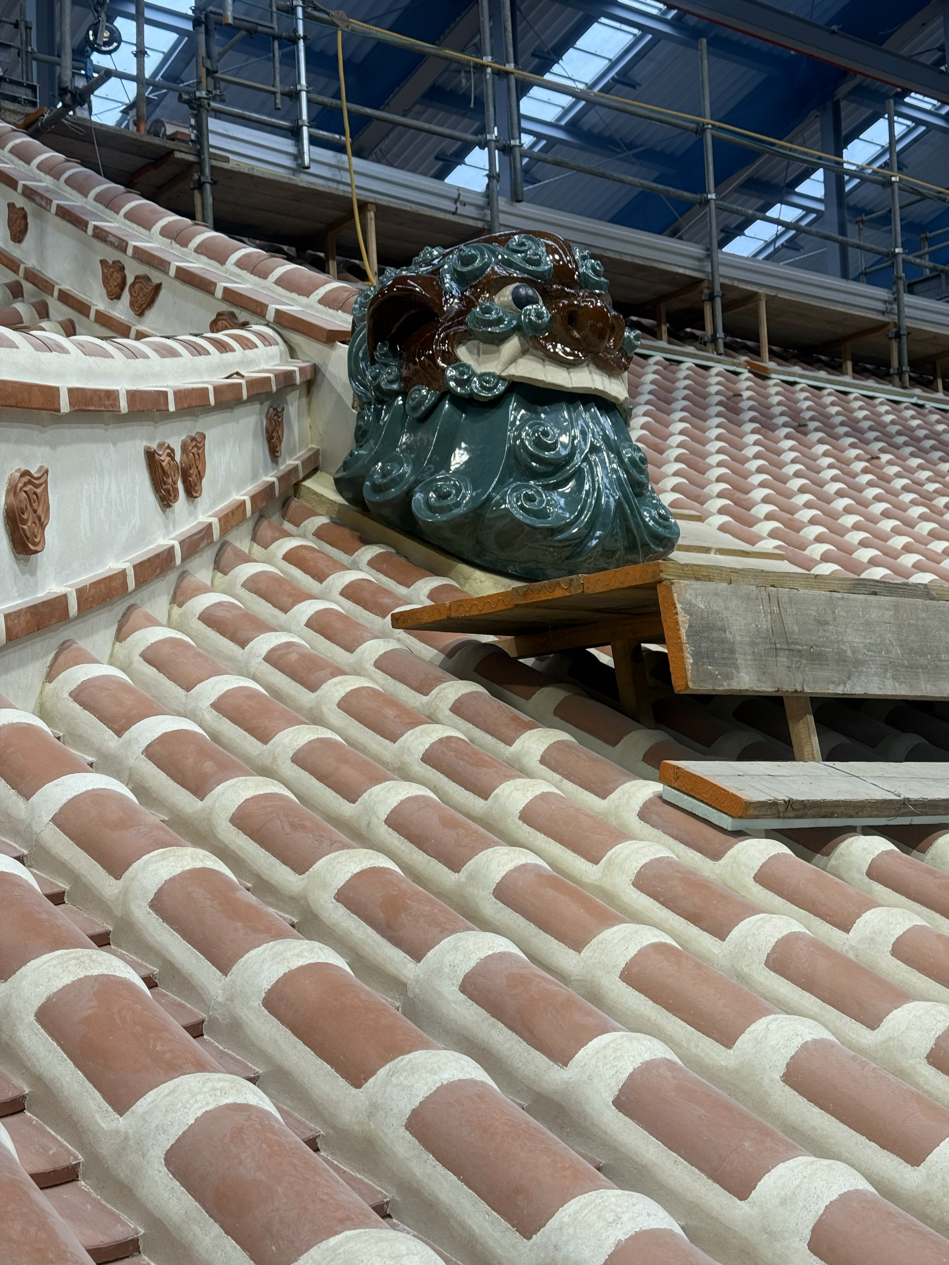 自身制作による鬼瓦吽形2体が、首里城正殿の屋根に設置されました。